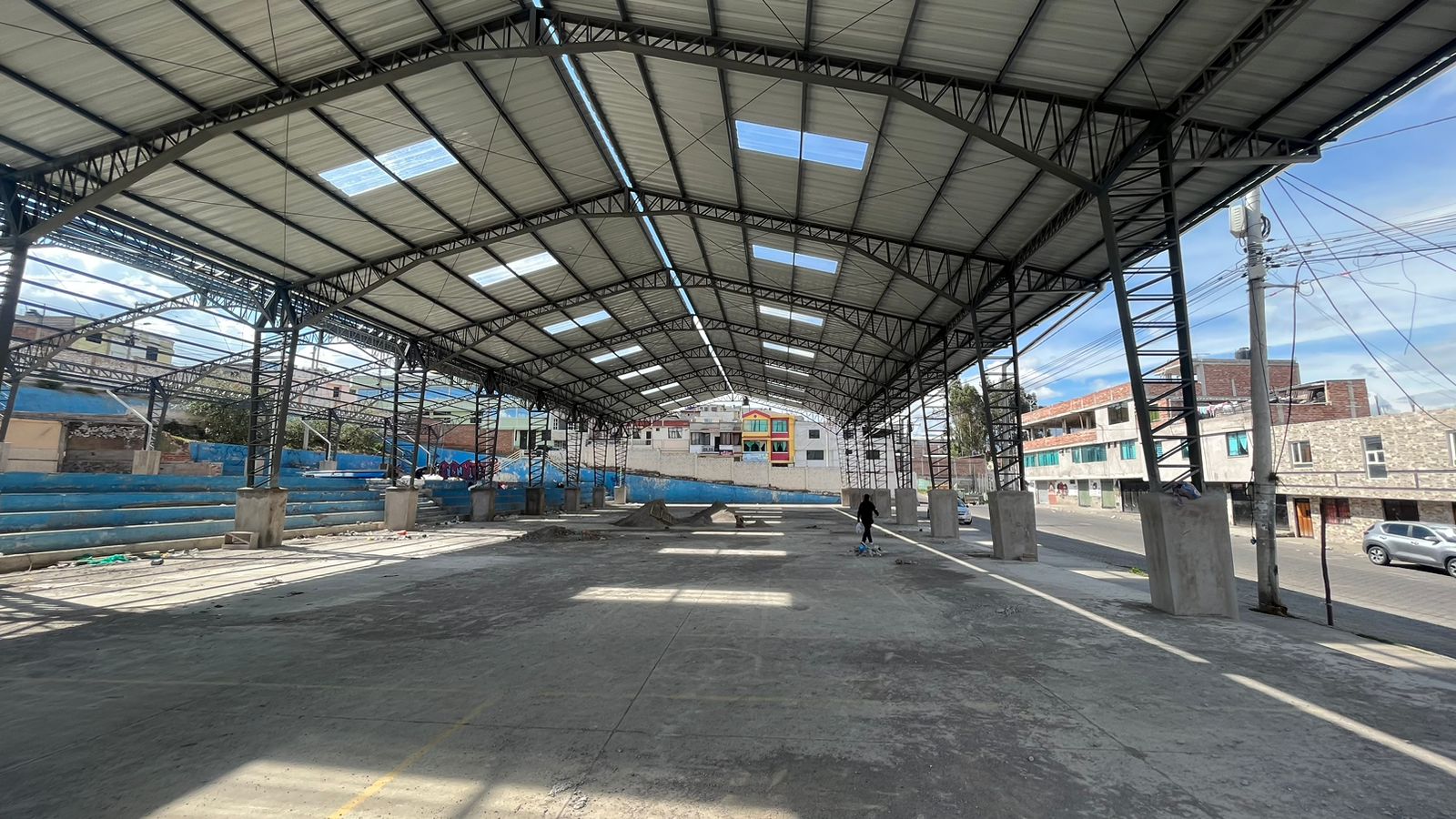 En la actualidad, los esfuerzos se centran en la soldadura de la cubierta, la instalación de cubierta translúcida de policarbonato para permitir la entrada de luz durante el día, la limpieza de la plataforma y el enlucido de las columnas, registrando un avance del 80% en la obra.