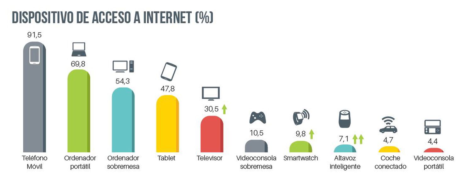 Además de ser un fenómeno generalizado, el uso de Internet a través del teléfono móvil es también muy intensivo: un 34,8% de los que utilizan el móvil para acceder declara hacerlo casi constantemente, y sólo un 15,6% de los que se conectan a través de este dispositivo lo hace con una frecuencia inferior a varias veces al día. Asimismo, cada vez se emplea más tiempo a navegar con este dispositivo, puesto que aquellos que se conectan más de una hora al día ascienden del 54,3% en 2016 al 61,5% en 2019; y lo utilizan más de cuatro horas el 17,7% (en comparación con el 15,3% de hace tres años).