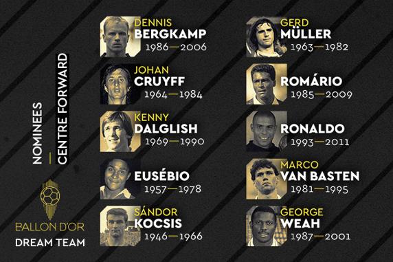 Para la punta del ataque, los seleccionados son: Dennis Bergkamp, Johan Cruyff, Kenny Daglish, Eusébio, Sándor Kocsis, Gerd Müller, Romário, Ronaldo Nazario, Marco Van Basten y George Weah.