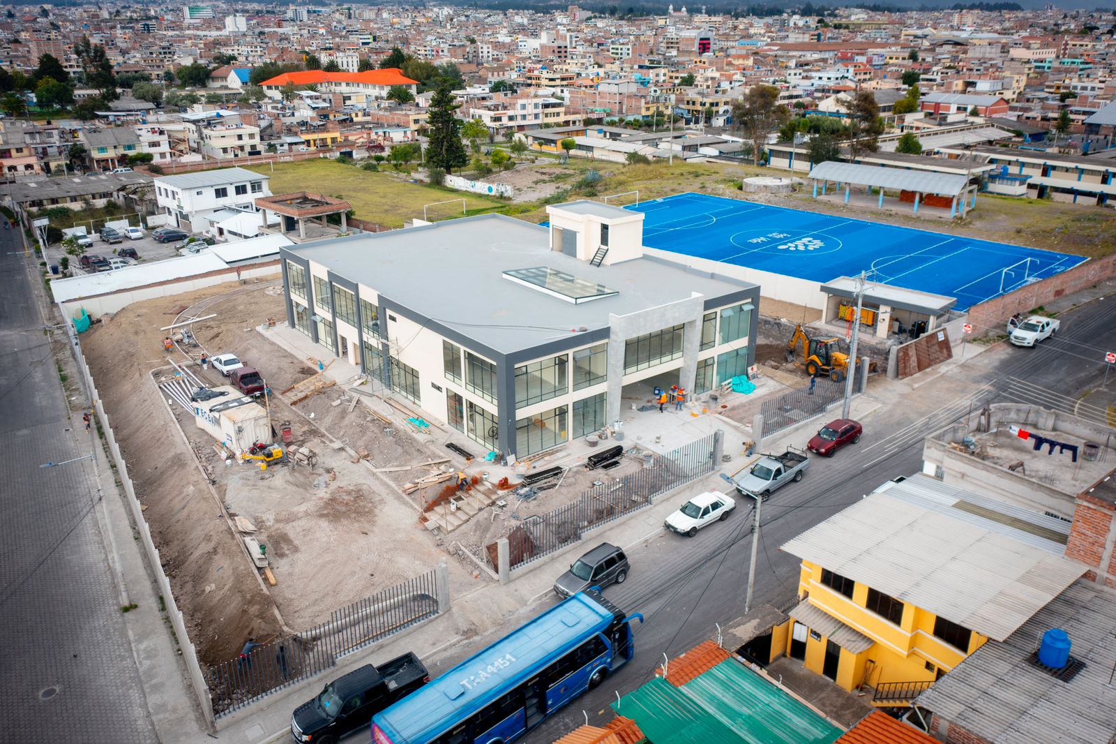 Actualmente, se están llevando a cabo trabajos complementarios en el exterior del edificio, incluyendo la construcción de parqueaderos y la preparación del suelo para la instalación de áreas verdes, camineras y gradas. En el interior, se están instalando puertas y adecuando los baños, con la participación de un equipo de trabajo compuesto por 18 personas.