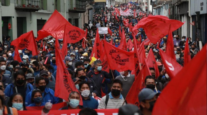Agrupaciones como la Confederación Ecuatoriana de Organizaciones Clasistas Unitaria de Trabajadores (Cedocut), la Unión Nacional de Educadores (UNE), estudiantes y el Frente Unitario de Trabajadores (FUT), se apostaron sobre la avenida 10 de Agosto. Lo hicieron a la altura de la Caja del Instituto Ecuatoriano de Seguridad Social (IESS), para empezar la caminata hacia el Centro Histórico.